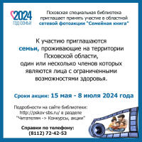 Акция приурочена к Году семьи в России. К участию в Акции приглашаются семьи, проживающие на территории Псковской области, один или несколько членов которых являются лица с ограниченными возможностями здоровья. Для участия в Акции необходимо: сделать фотографию, на которой запечатлена читающая семья участника Акции с книгой или один из членов семьи с книгой, которую любят читать всей семьёй, или с книгой, передающейся в семье из поколения в поколение. Обложка книги должна быть хорошо видна! Ответить на вопрос: чем дорога для участника Акции и его семьи запечатлённая на фото книга? Заполнить заявку и прислать её вместе с фотографией на электронную почту posbs@pskovlib.ru с указанием в теме письма «Семейная книга». Срок приёма работ и заявок: с 15 мая по 8 июля 2024 года включительно.